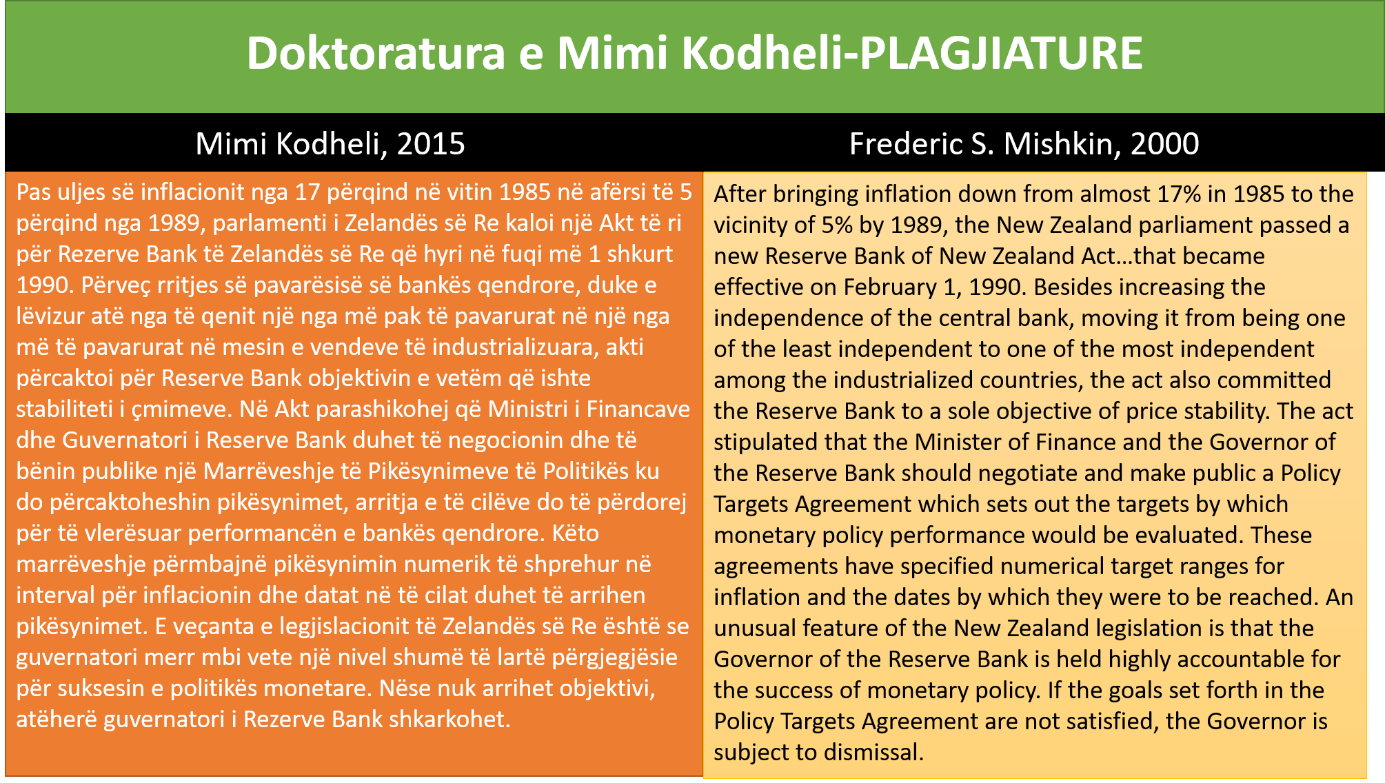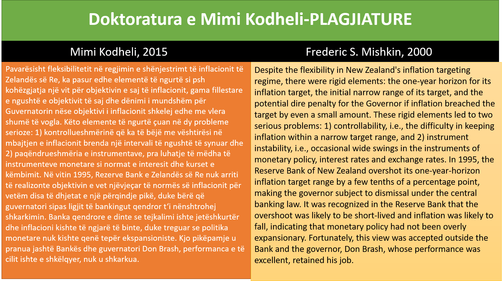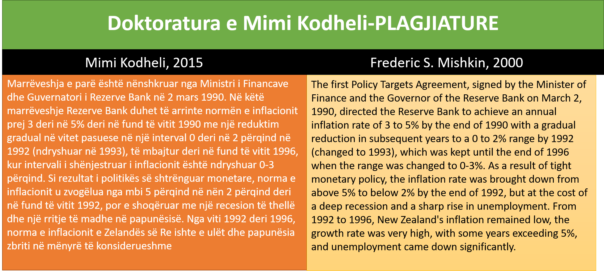 Me sa kam arritur të zbuloj unë, zonja Mimi Kodheli kopjimin më të madh e ka bërë prej artikullit “From monetary targeting to inflation targeting: lessons from the industrialized countries”, me autor Frederic S. Mishkin, i vitit 2000, prej të cilit ka kopjuar dy faqe e gjysmë te Tezës së saj (faqet 21, 22, 23 dhe 24), të cilat korrespondojnë me faqet 11,12 dhe 13 të artikullit në anglisht, të cilin e gjeni në internet në këtë adresë: https://pdfs.semanticscholar.org/…/3e358ebc297698dfbb8737fa…