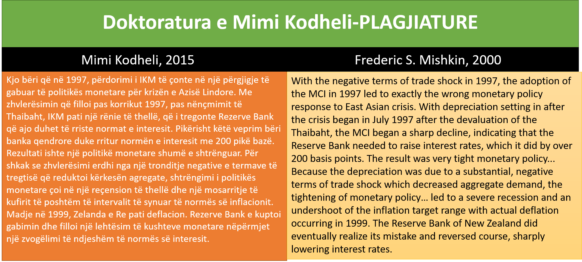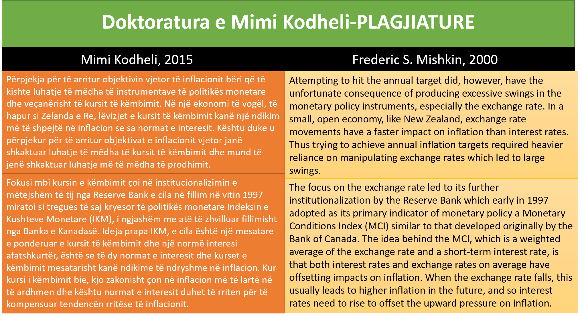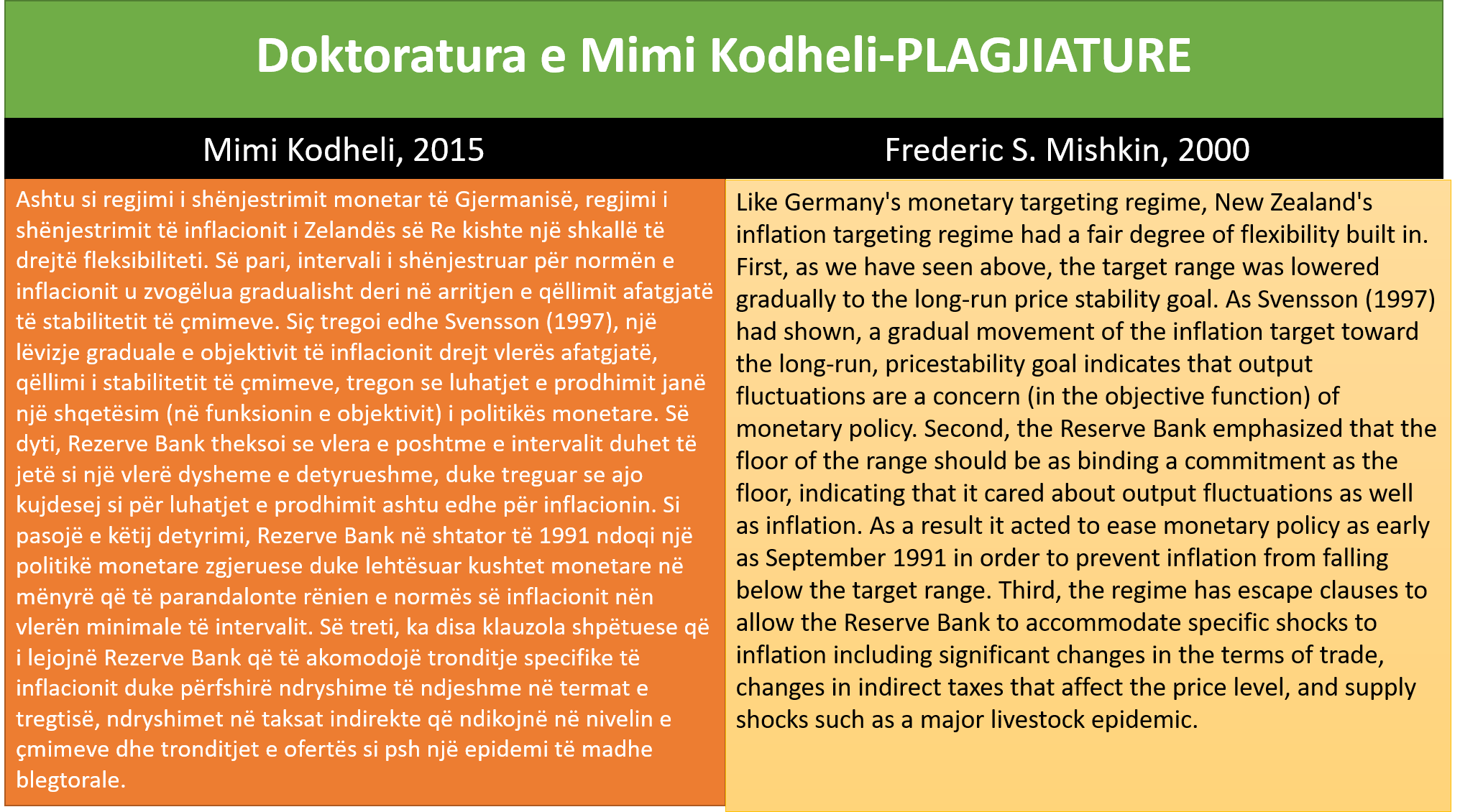 Me sa kam arritur të zbuloj unë, zonja Mimi Kodheli kopjimin më të madh e ka bërë prej artikullit “From monetary targeting to inflation targeting: lessons from the industrialized countries”, me autor Frederic S. Mishkin, i vitit 2000, prej të cilit ka kopjuar dy faqe e gjysmë te Tezës së saj (faqet 21, 22, 23 dhe 24), të cilat korrespondojnë me faqet 11,12 dhe 13 të artikullit në anglisht, të cilin e gjeni në internet në këtë adresë: https://pdfs.semanticscholar.org/…/3e358ebc297698dfbb8737fa…