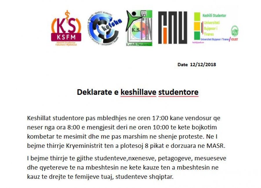 Këshillat studentorë pas mbledhjes në orën 17:00 kanë vendosur që nesër nga ora 8:00 e mëngjesit deri në orën 10:00 të ketë bojkotim kombëtar të mesimit dhe më pas marshim në shenjë proteste.
