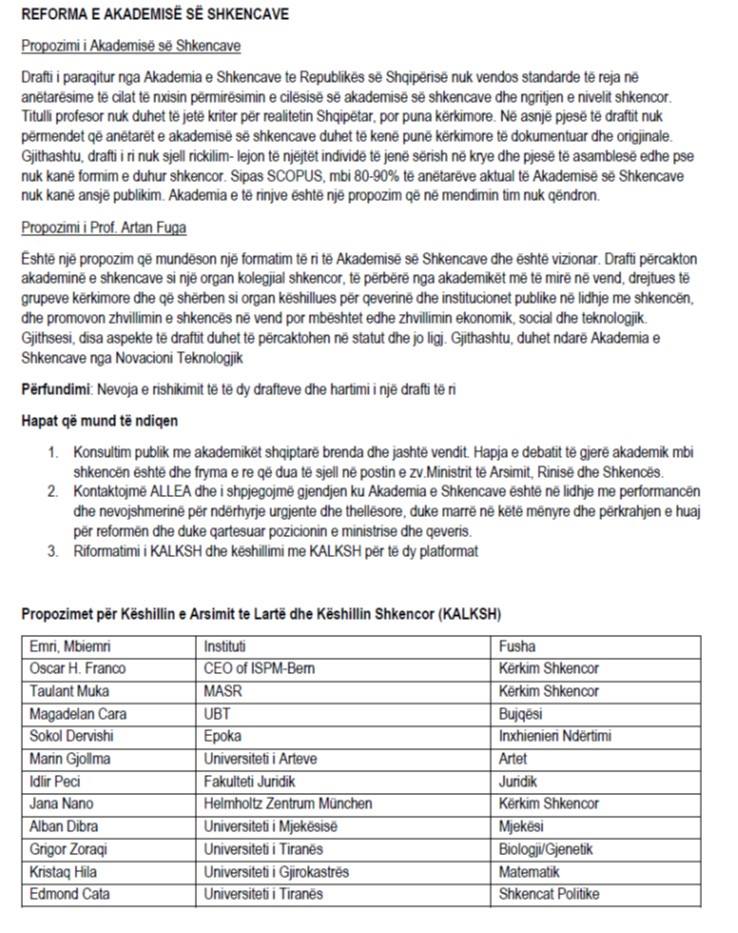 Akdemia e Shkencave: Këtë javë jam marrë dhe me problemin e akademisë së shkencave: kam takuar dhe z. Gjinushin dhe z. Fuga dhe bazuar në argumentat në fund të këtij dokumenti unë mendoj se është e nevojshme rishikimi i të dy drafteve dhe hartimi i një drafti të ri: asnjëri prej drafteve nuk siguron reform të akademisë së shkencave.