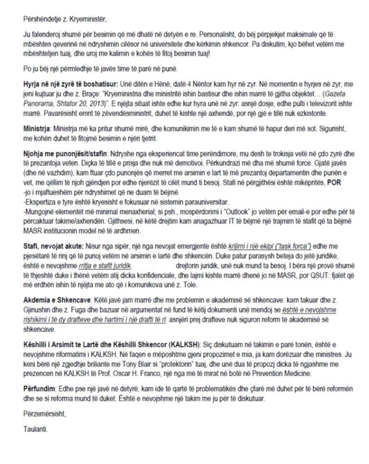 Këshilli i Arsimit te Lartë dhe Këshilli Shkencor (KALKSH): Siç diskutuam në takimin e parë tonën, është e nevojshme riformatimi i KALKSH. Në faqen e mëposhtme gjeni propozimet e mia, ja kam dorëzuar dhe ministres. Ju keni bërë një zgjedhje briliante me Tony Blair si “protektorin” tuaj, dhe unë dua të propozj dicka të ngjashme me prezencen në KALKSH të Prof. Oscar H. Franco, një nga më të miret në botën e Prevention Medicine.
