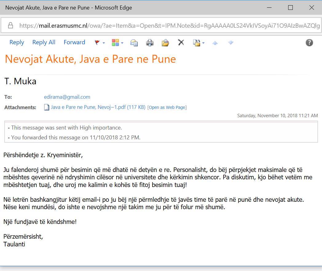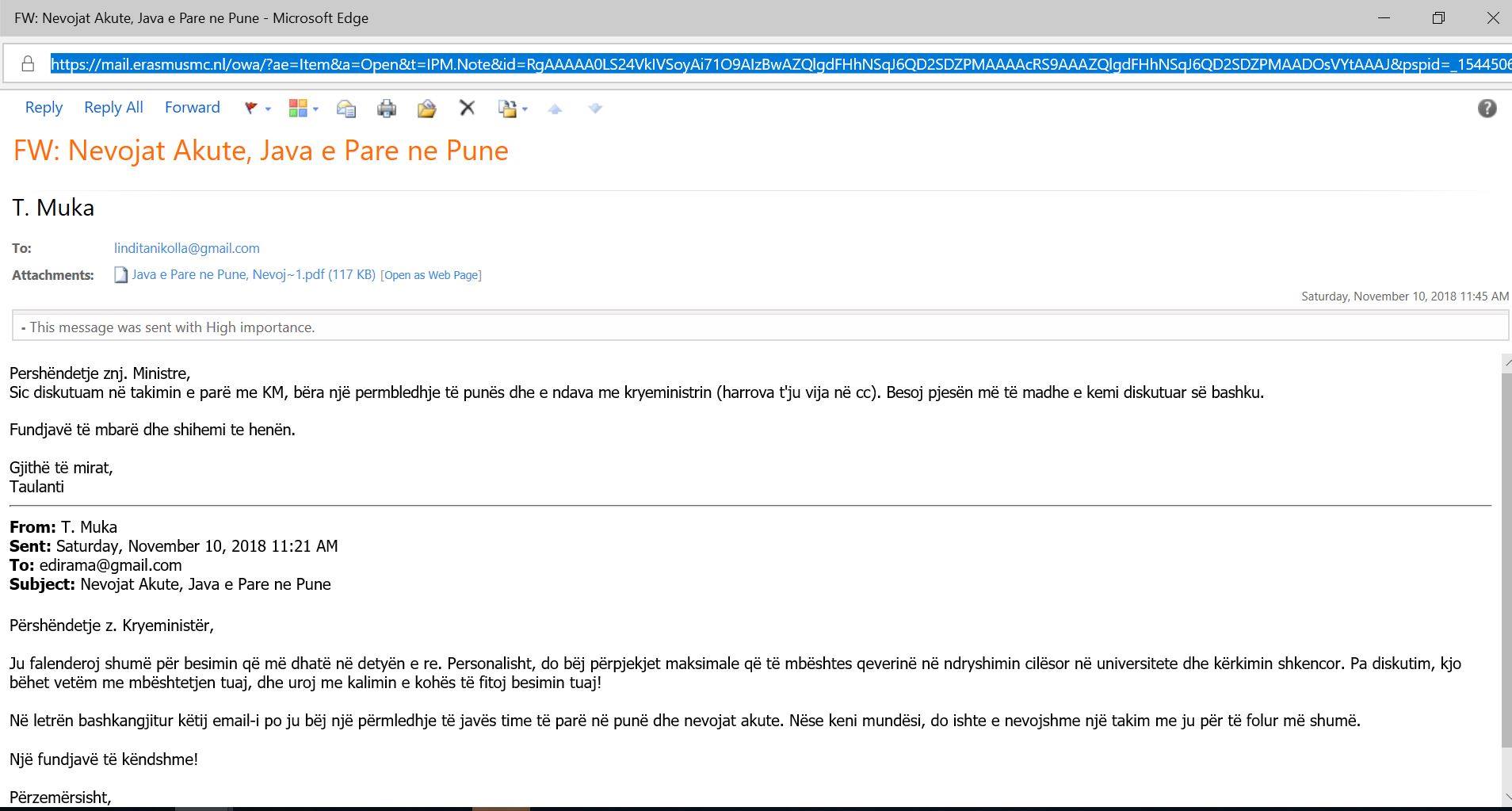 Studiuesi Taulant Muka ka publikuar të gjitha E-mailet dhe mesazhet që ka shkëmbyer me kryeministrin gjatë kohës që ishte në ministrinë e Arsimit.