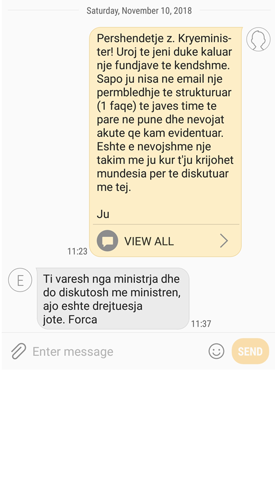 Ja cfarë i kërkova unë kryeministrit në fund të javës time të parë në punë- letra (dhe email-i) që i nisa KM dhe ministres, dhe përgjigja (në foto) që mora nga KM! Ne kishim rënë dakord që une do isha mbi ministren, por nga përgjigja që më dërgoi KM unë kuptova për herë të parë që isha prerë në besë dhe vërtetova dyshimet e mia që atë pozicion ma kishin dhënë për të më mbyllur gojën, dhe JO PER TE BERE PUNEN!