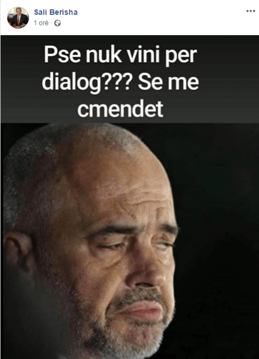 “Pse nuk vini në dialog?? se më çmendet”, shkruhet në mesazhin e postuar nga Berisha, që shoqërohet me një foto të kryeministrit Edi Rama.