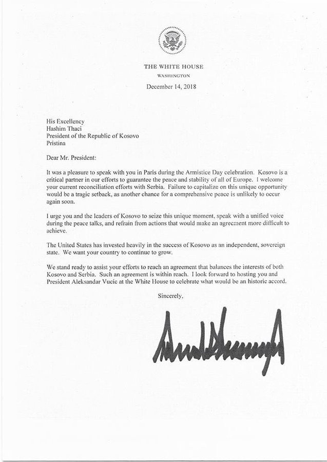 Në letrën që u shpërnda nga zyra e presidentit Thaçi, presidenti Trump, bën thirrje që “të gjithë udhëheqësit e Kosovës, ta shfrytëzojnë këtë moment unik, të flasin me një zë të vetëm gjatë negociatave për paqe, dhe të përmbahen nga veprimet të cilat mund ta vështirësojnë arritjen e marrëveshjes”.