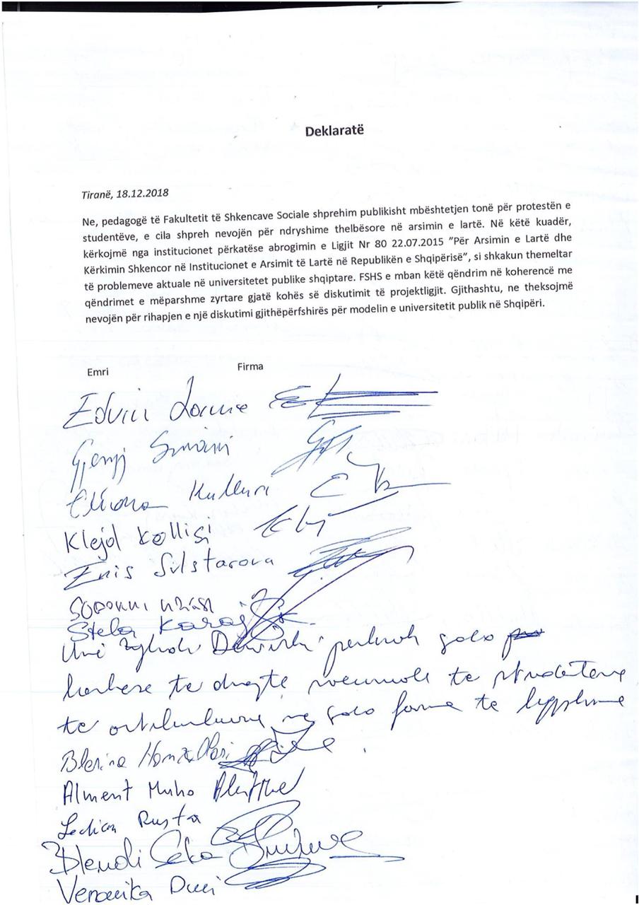 Ata kanë firmosur një dokument të shkurtër ku i kërkohet qeverisë shfuqizimi i ligjit problematik të arsimit të lartë që cilësohet, deri më tani si thelbi i kaosit të shkaktuar në universitetet publike.pedagogët e quajnë atë një zëri si “shkakun themeltar të problemeve në universitetet publike shqiptare”.