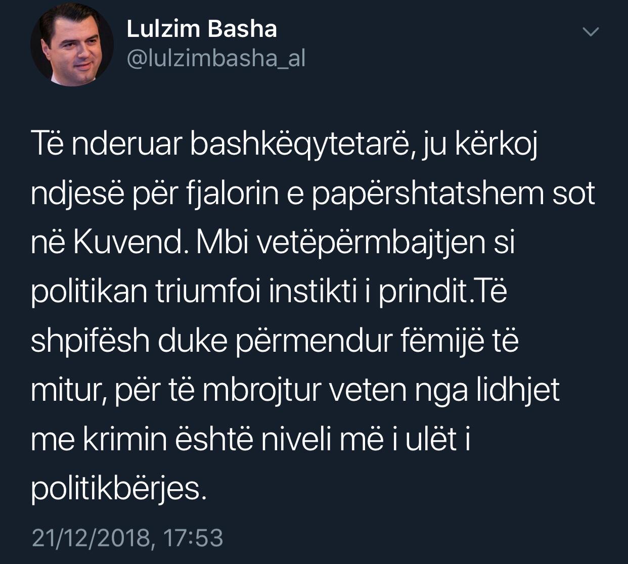 “Të nderuar bashkëqytetarë, ju kërkoj ndjesë për fjalorin e papërshtatshem sot në Kuvend. Mbi vetëpërmbajtjen si politikan triumfoi instikti i prindit.Të shpifësh duke përmendur fëmijë të mitur, për të mbrojtur veten nga lidhjet me krimin është niveli më i ulët i politikbërjes.”, shkruan Basha.