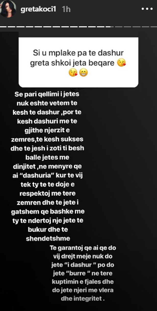 ”Të garantoj që ai që do vijë drejt meje nuk do jetë i dashur por do jetë burrë me plot kuptimin e fjalës dhe do jetë njeri me vlera dhe integritet.“- shkruan këngëtarja në postim.