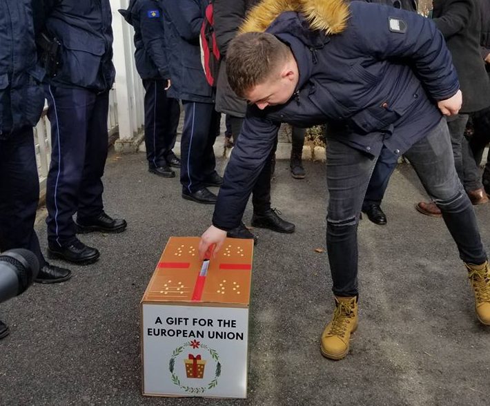 Studentët me të arritur para zyrave të BE-së, në mënyrë simbolike, secili prej tyre kanë futur pasaportat në një pako të cilën thonë se do ta lënë pranë dyerve të objektit.