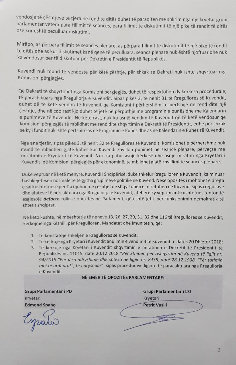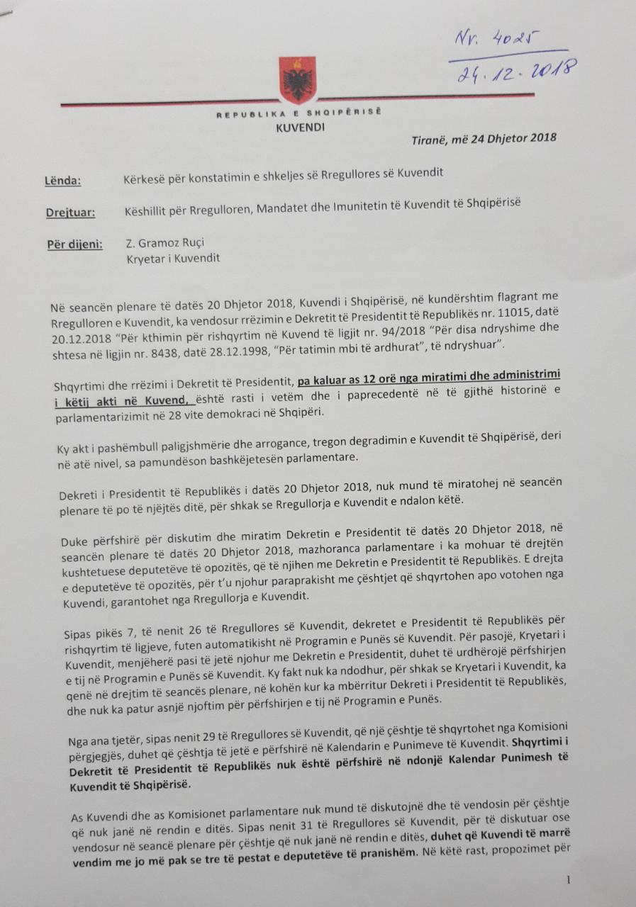 2-Të kërkojë nga Kryetari i Kuvendit anulimin e vendimit të Kuvendit të datës 20 dhjetor 2018.