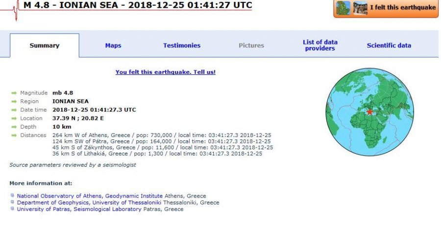 Sipas Institutit Sizmiologjik të Athinës, tërmeti u ndje mëngjesin e kësaj të marte rreth orës 03:41, në jug të Zakynthos.