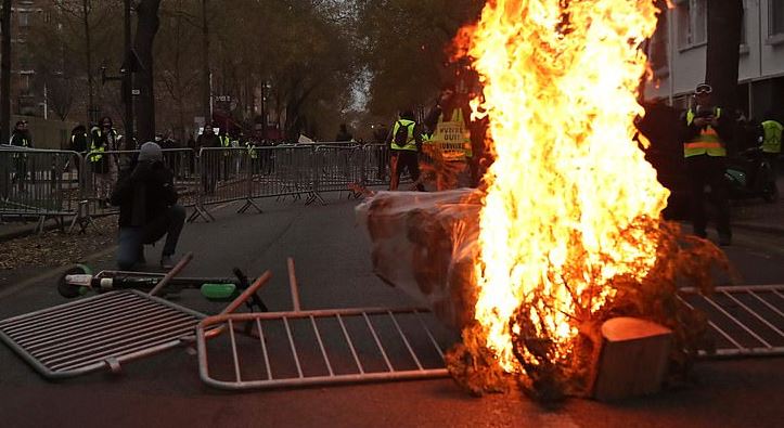 Rrugët e Parisit janë ndezur gjatë protestave të “jelekëve të verdha” në Paris, ku si pasojë e djegies së koshave dhe makinave kulla Eiffel është mbuluar nga një tym i zi.