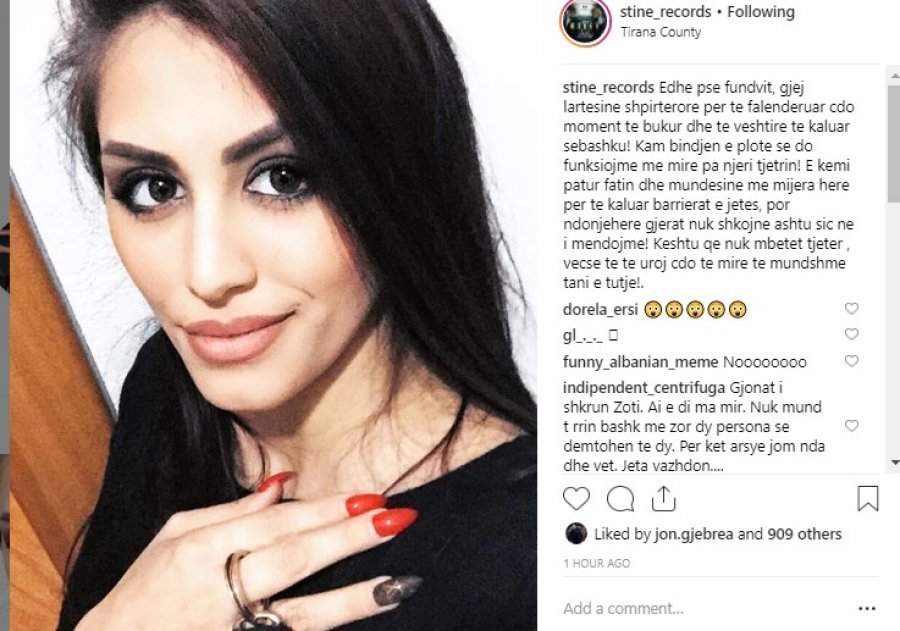 “Edhe pse fundvit, gjej lartesine shpirterore per te falenderuar cdo moment te bukur dhe te veshtire te kaluar sebashku! Kam bindjen e plote se do funksiojme me mire pa njeri-tjetrin! E kemi patur fatin dhe mundesine me mijera here per te kaluar barrierat e jetes, por ndonjehere gjerat nuk shkojne ashtu sic ne i mendojme! Keshtu qe nuk mbetet tjeter, vecse te te uroj cdo te mire te mundshme tani e tutje!,”-përfundon Stine në rrjete sociale.