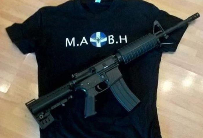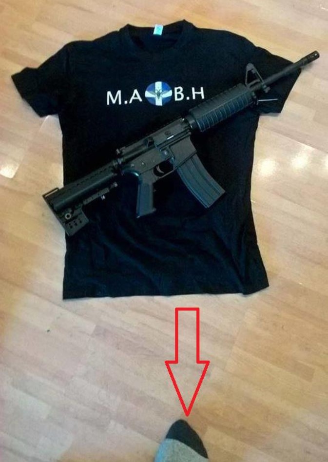 Ai poston një foto në Facebook ku duket një person që ka fotografuar bluzën me mbishkrimin MAVI dhe një armë automatike mbi të.