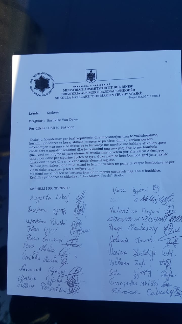 Nxënësit dhe prindërit dorëzuan në shkollë një peticion.