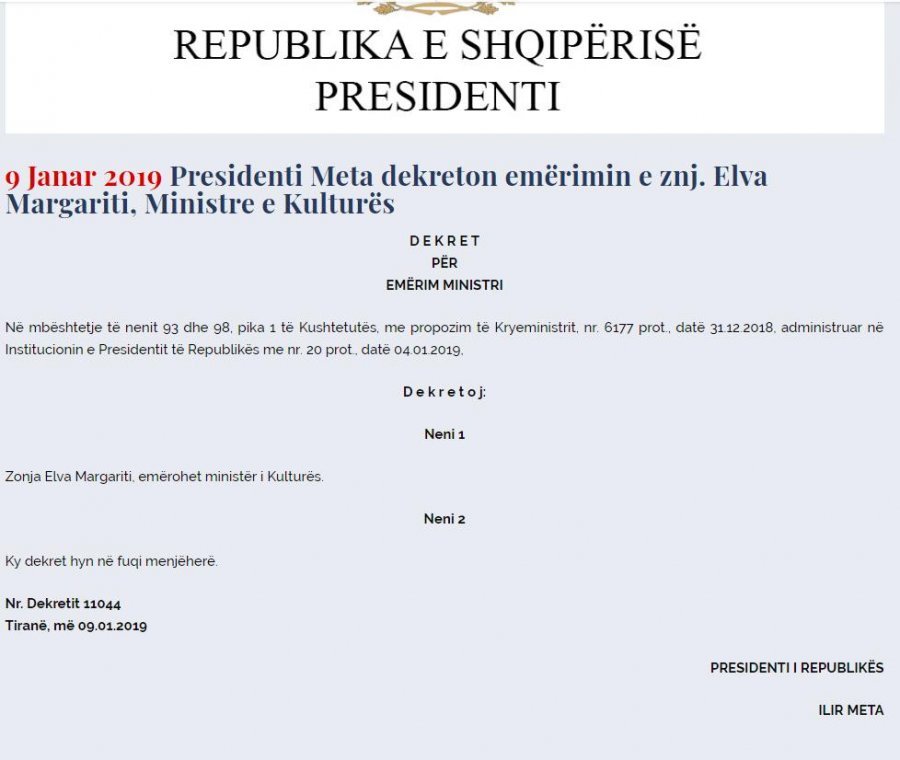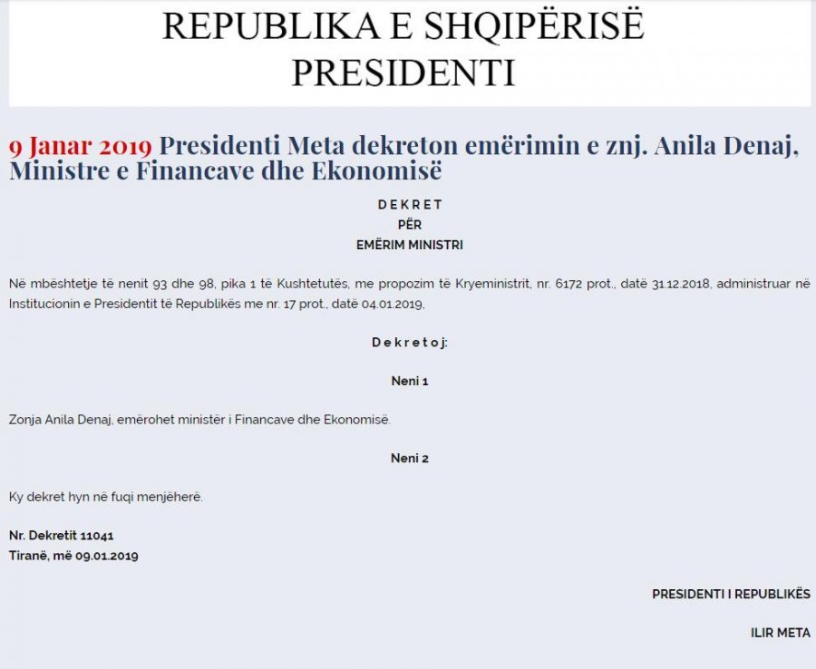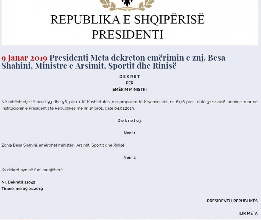 Presidenti ka dekretuar mbrëmjen e sotme, ministren e re të Arsimit, atë të Kulturës, te Financave dhe Infrastruktures.