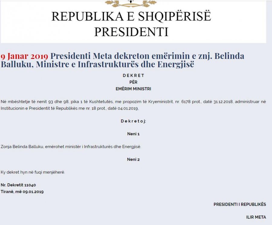 Presidenti i Shqipërisë Ilir Meta ka vendosur mbrëmjen e sotme të dekretojë ministrat e rinj të propozuar nga Edi Rama.