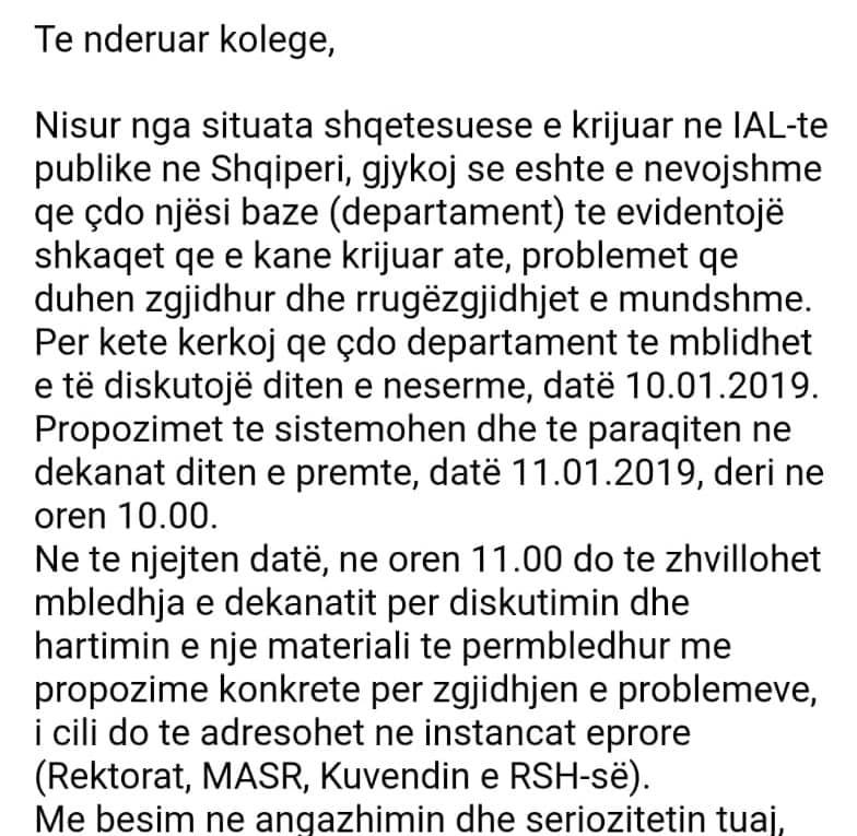 Deputeti demokrat Luçiano Boçi ka publikuar një E-mail të një dekani drejtuar pedagogëve, ku i kërkon të bëjnë mbledhje për situatën e studentëve.