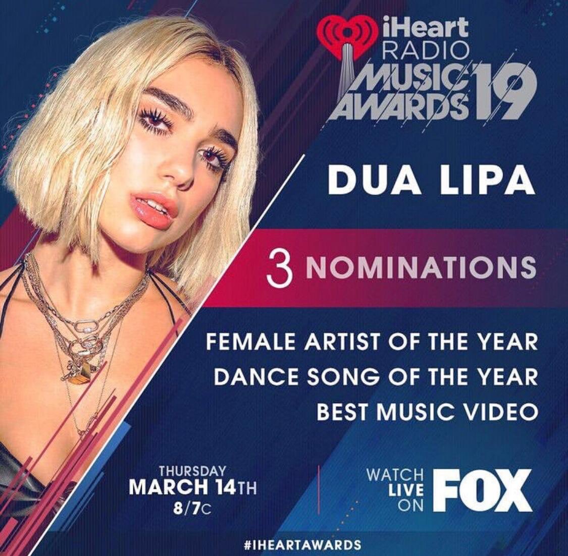 Pas dy nominimeve në Grammy, Dua ka marrë nominime në iHeart Radio. 23-vjeçarja u nominua për 3 çmime, ‘Artisja e vitit’, ‘Koreografia më e mirë e vitit’ dhe ‘Video muzikore më e mirë’.