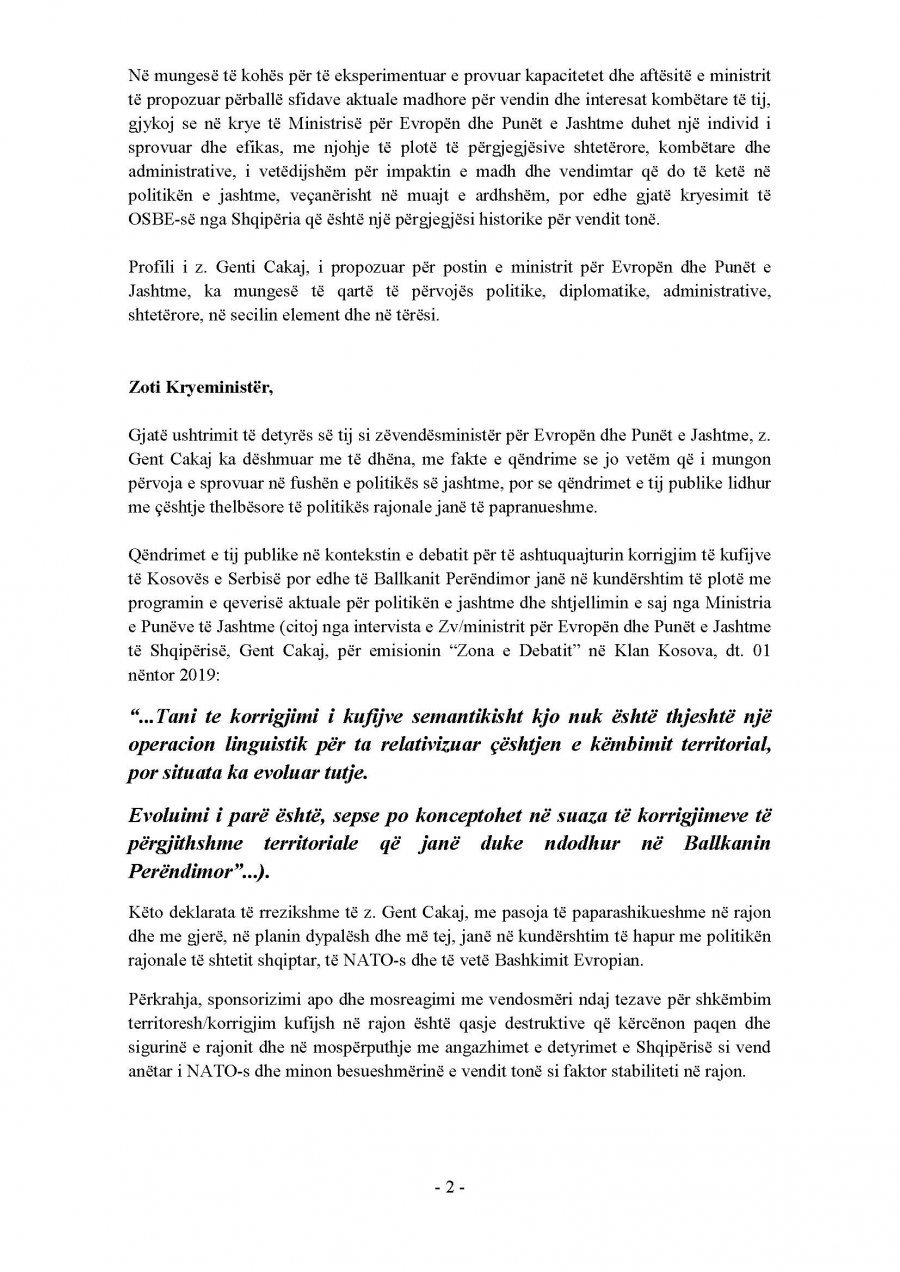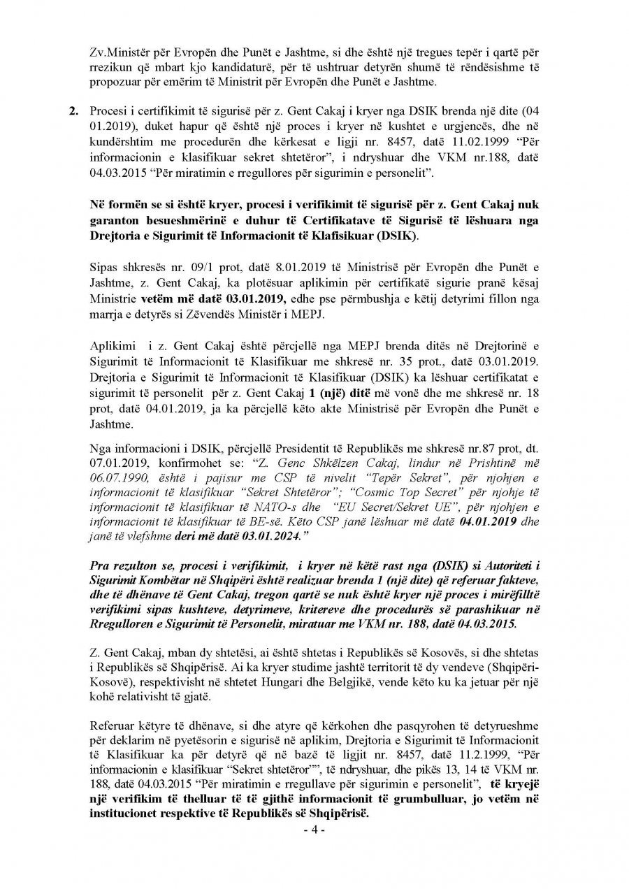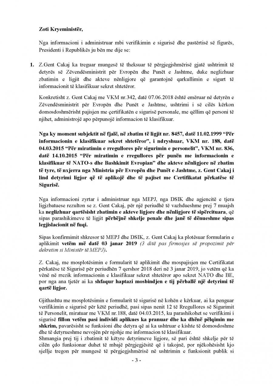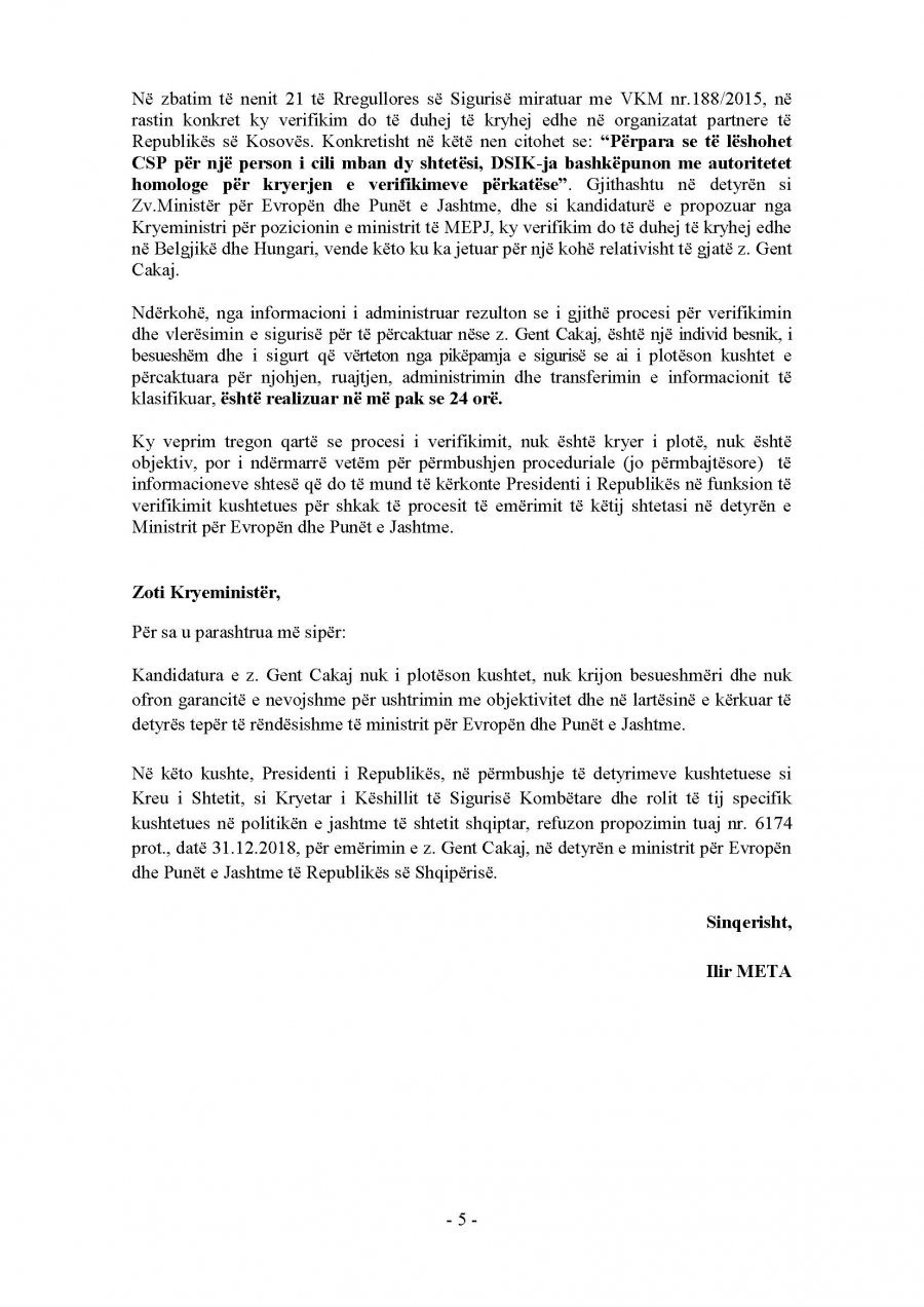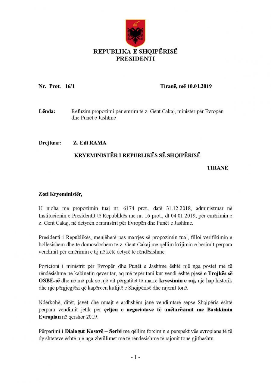 Presidenti i vendit Ilir Meta ka kthyer vendimin për emërimin e Gent Cakajt. Ai nuk e dekreton si ministër të Jashtëm.
