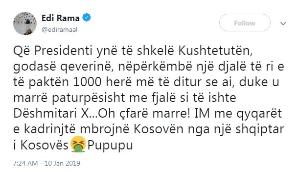 “Që Presidenti ynë të shkelë Kushtetutën, godasë qeverinë, nëpërkëmbë një djalë të ri e të paktën 1000 herë më të ditur se ai, duke u marrë paturpësisht me fjalë si të ishte Dëshmitari X…Oh çfarë marre! IM me qyqarët e kadrinjtë mbrojnë Kosovën nga një shqiptar i Kosovës Pupupu”, ka shkruar Rama.