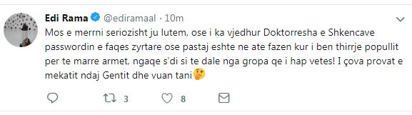 Mos e merrni seriozisht ju lutem, ose i ka vjedhur Doktorresha e Shkencave passwordin e faqes zyrtare ose pastaj eshte ne ate fazen kur i ben thirrje popullit per te marre armet, ngaqe s’di si te dale nga gropa qe i hap vetes! I çova provat e mekatit ndaj Gentit dhe vuan tani”