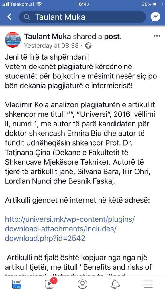 Taulant Muka ka publikuar një tjetër denoncim për plagjaturat. Këtë herë bëhet fjalë për dekanen e Infermierisë.