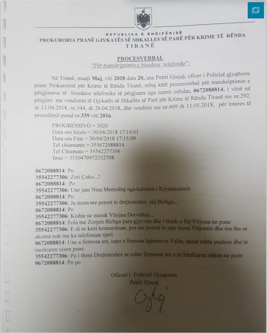 Çuko, i cili ndodhej nën përgjim nga Prokuroria e Krimeve të Rënda, pohon në bisedë se e kishte firmosur punësimin më herët atë ditë.