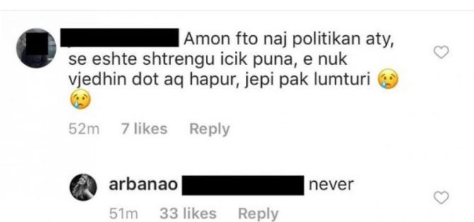 Por Arbana e ka bërë një kategorizim për personat që nuk do të ftonte në emision. Ajo i është përgjigjur një komentuese në rrjetet sociale se ata që nuk do të ftonte kurrë në emision janë politikanët.