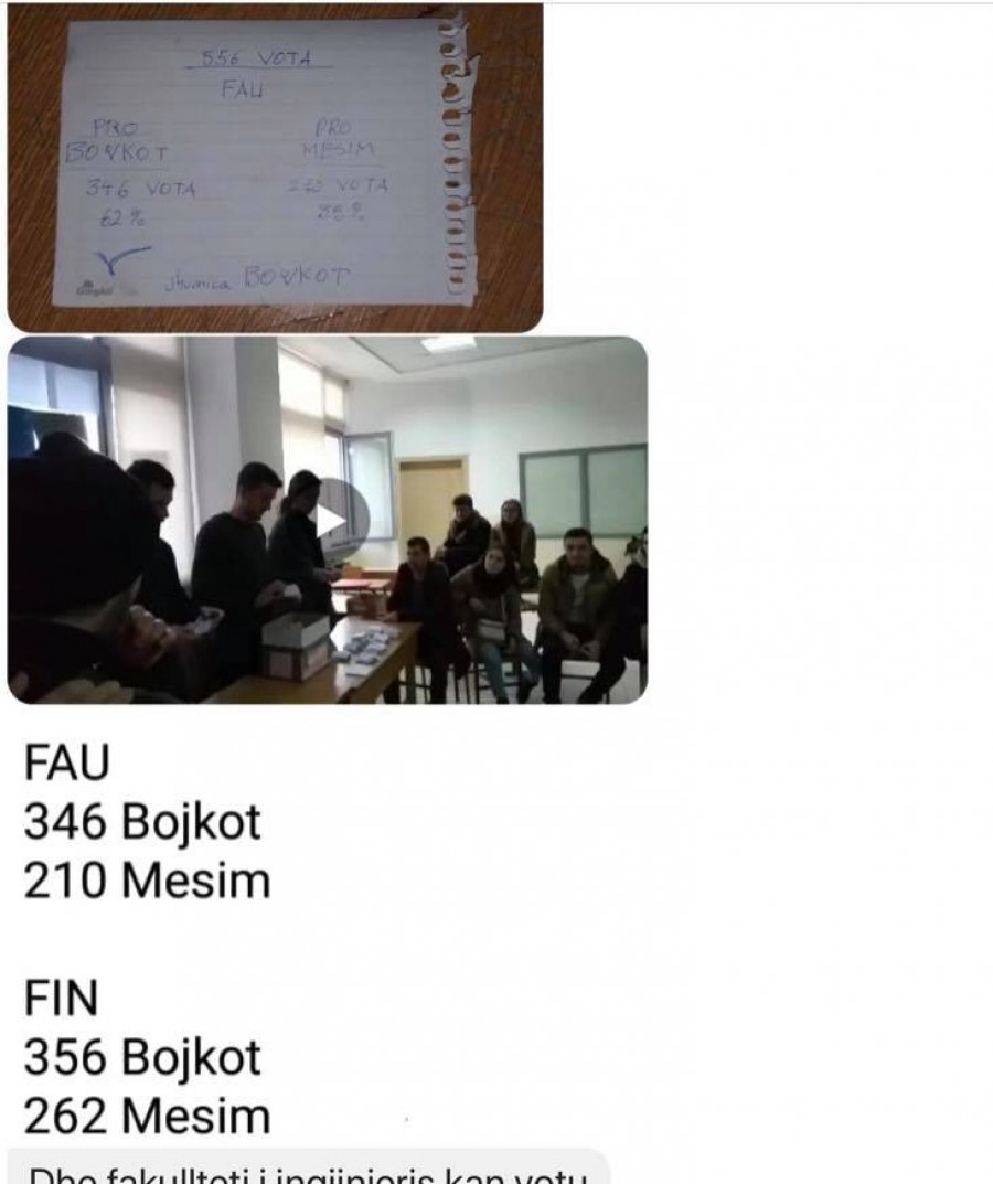 Pershendetje doktorr tek fakullteti arkitektures dhe urbanistikes eshte mbajtur nje votim nga qdo student 62.2 % 346 student kan votuar per bojkot ndersa 37.8% 210 student per mesim fakullteti yn ka votuar per bojkot ku e sheh kryeministri shumicen ? Gjeja me interesante esht se ne media ditve te fundit kan dal sikir studentet duan te kthehen dhe sjapin lajme Profesoret e fakulltetit ton nuk dalin pro nesh sepse marrin leje ndertimi dhe i ka kercenuar