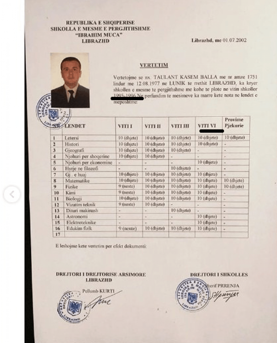 Mirëpo, sipas certifikatës së gjimnazit, Balla ka mbaruar arsimin e mesëm gjatë viteve 1995-1996, ndërsa ka dhe një lapsus tjetër në këtë dokument. Viti i IV është shkruar viti i VI, ndërsa rezulton se Balla e ka nisur gjimnazin 18-vjeç.