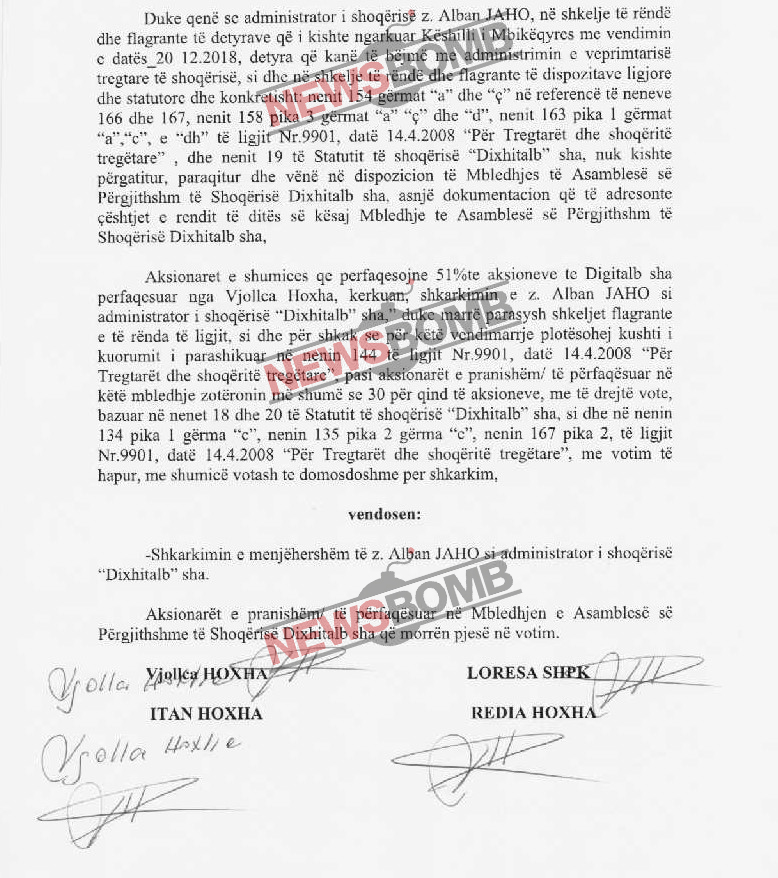 Vendimi për shkakrimin e menjëhershëm të Jahos, duket se është marrë “ekskluzivisht” me votat e familjes Hoxha, pasi ndër katër aksionarët që kanë votuar për shkakrimin e tij, tre janë Vjollca, Itan dhe Redia Hoxha.