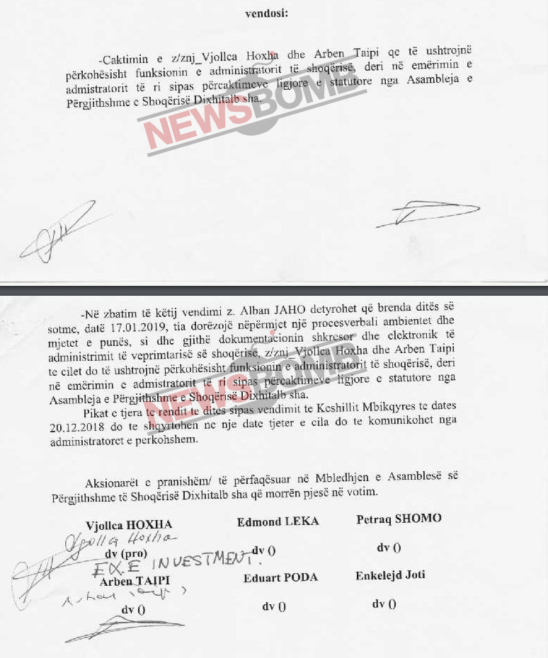 “Zoti Alban Jaho detyrohet që brenda ditës së sotme, t’ia dorëzojë nëpërmjet një procesverbali ambientet dhe mjetet e punës, si dhe të gjithë dokumentacionin shkresor dhe elektronik të administrimit të veprimtarisë së shoqërisë znj. Vjollca Hoxha dhe z. Arben Taipi”, thuhet në vendimin e siguruar nga Newsbomb.al.