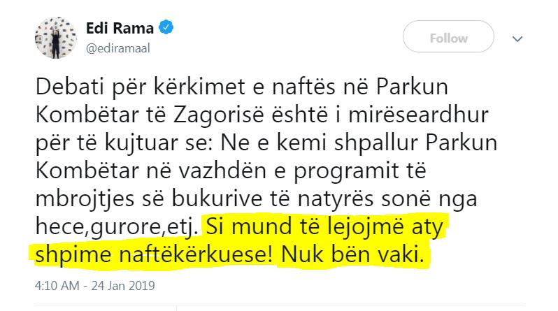 Ai mund të dalë dhe të thotë se këto fakte janë fotomontazh! Çfarë nuk bën vaki me këtë kryeministër! Por e vërteta është se Edi Rama i ka gënjyer shqiptarët sy për sy. Ai ka firmosur që në Parkun Kombëtar të Zagorisë, pjesë e bllokut 4, të shpohet dhe të kërkohet për naftë!