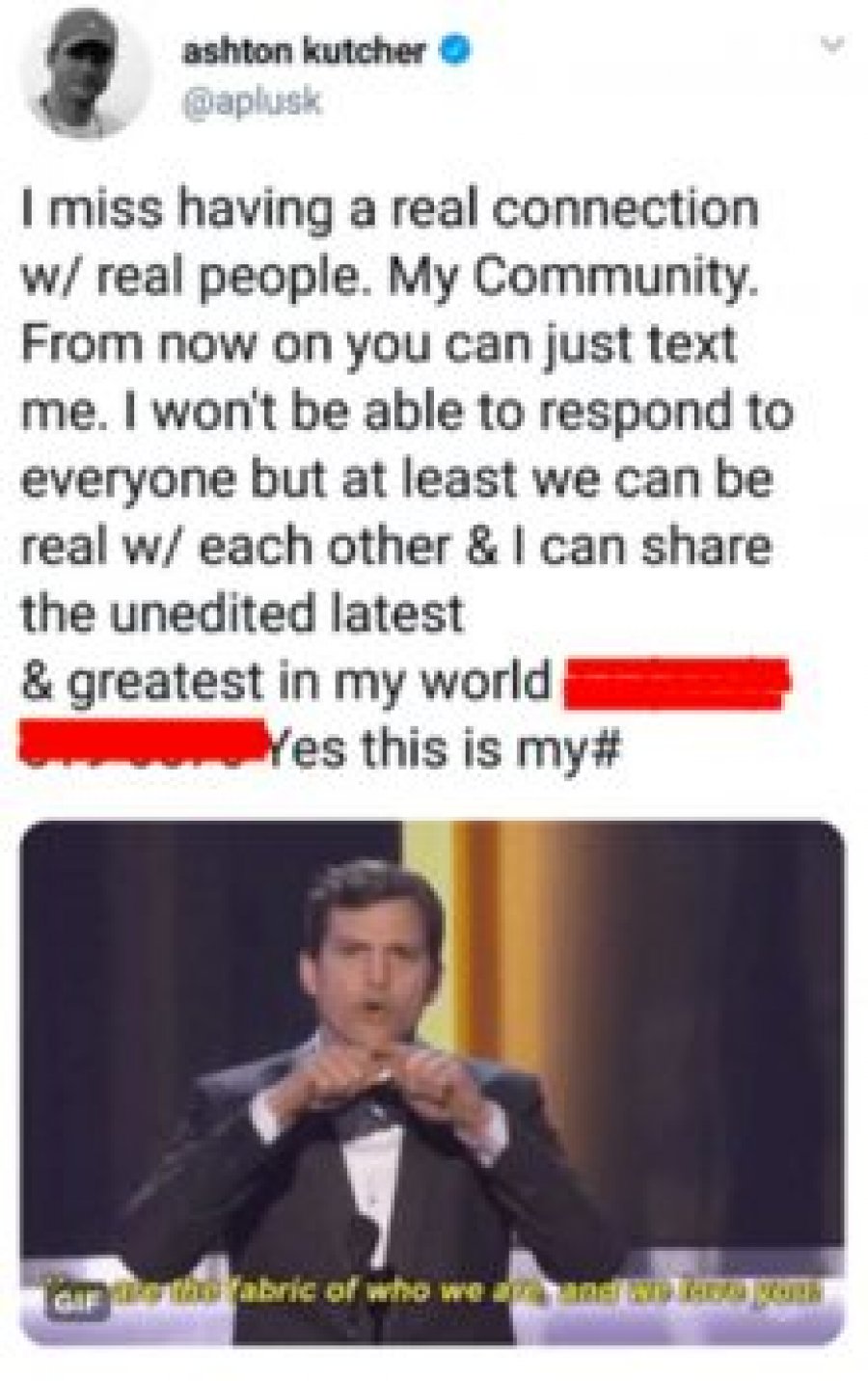 Këtë ndjesi ka dhe aktori i famshëm, Ashton Kutcher. Aktori ka nxjerrë qëllimisht numrin e telefonit përmes një mesazhi duke treguar se i mungojnë komunikimet me njerëzit e zakonshëm.