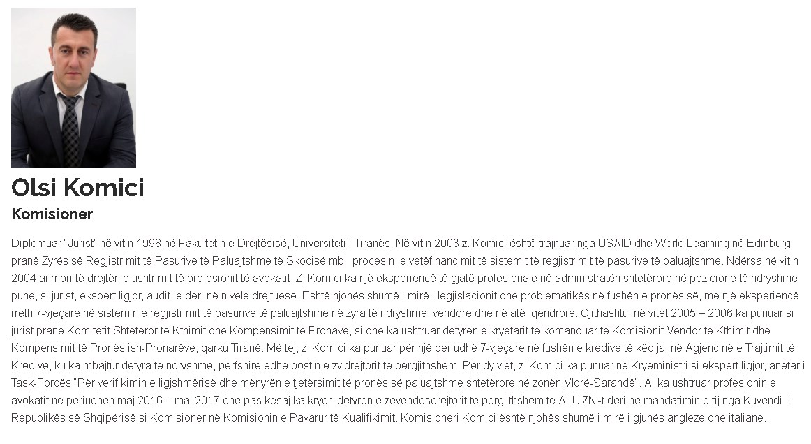 Konkretisht, për Olsi Komicin shkruhet: Për dy vjet, z. Komici ka punuar në Kryeministri si ekspert ligjor, anëtar i Task-Forcës “Për verifikimin e ligjshmërisë dhe mënyrën e tjetërsimit të pronës së paluajtshme shtetërore në zonën Vlorë-Sarandë“. Ai ka ushtruar profesionin e avokatit në periudhën maj 2016 – maj 2017 dhe pas kësaj ka kryer detyrën e zëvendësdrejtorit të përgjithshëm të ALUIZNI-t deri në mandatimin e tij nga Kuvendi i Republikës së Shqipërisë si Komisioner në Komisionin e Pavarur të Kualifikimit. Komisioneri Komici është njohës shumë i mirë i gjuhës angleze dhe italiane.