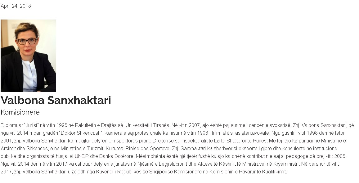Për anëtaren Valbona Sanxhaktari: Nga viti 2014 deri në vitin 2017 ka ushtruar detyren e juristes në Njësinë e Legjislacionit dhe Akteve të Këshillit të Ministrave, në Kryeministri. Në qershor të vitit 2017, znj. Valbona Sanxhaktari u zgjodh nga Kuvendi i Republikës së Shqipërisë Komisionere në Komisionin e Pavarur të Kualifikimit.