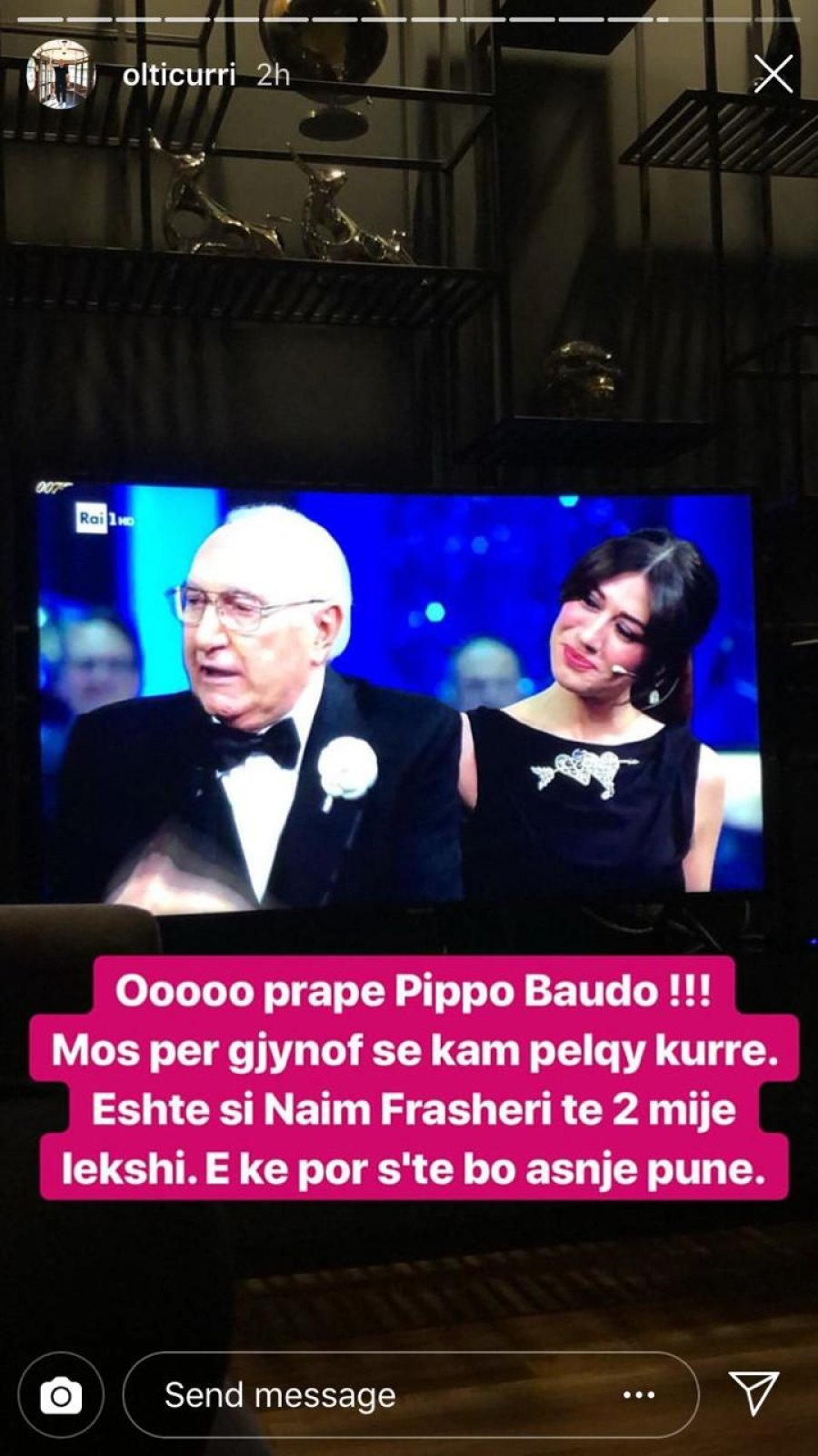 Teksa ky i fundit u shfaq në ekranin e “Rai 1” gjatë festivalit Sanremo, Olti Curri publikoi një foto dhe shkroi: Ooooo prapë Pippo Baudo!!! Mos për gjynof se kam pëlqy kurrë. Është si Naim Frashëri te 2 mijë lekshi. E ke por s’të bo asnjë punë”.