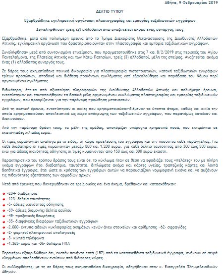 “Gjatë operacionit, i cili zgjati disa ditë u arrestuan tre persona, shtetas jo greke, por nuk dihet identiteti i tyre , ndërsa një tjetër është shpallur në kërkim“, thuhet në njoftimin zyrtar të policisë helene.