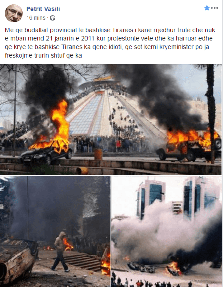 “Me që budallait provincial të bashkisë së Tiranës i kanë rrjedhur trutë dhe nuk e mban mend 21 janarin e 2011 kur protestonte vetë dhe ka harruar edhe që në krye të bashkisë Tiranë ka qenë idioti, që sot kemi kryeministër, po ja freskojmë trurin shtuf që ka”, shkruan Vasili në Facebook, bashkangjitur me disa foto nga protesta e 21 Janarit.