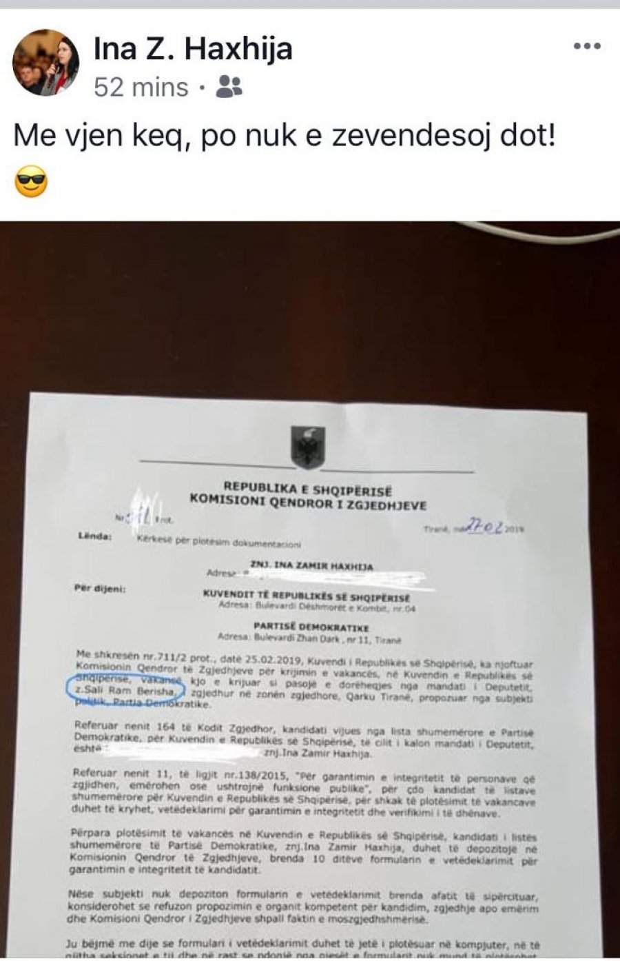 KQZ ka ftuar kandidaten për deputete, Ina Haxhija për të zëvendësuar ish-kryeministrin Sali Berisha, por me anë të një reagimi të shkurtër shoqëruar edhe me një foto të kërkesës së KQZ, ajo ka dhënë dhe përgjigjen e saj.