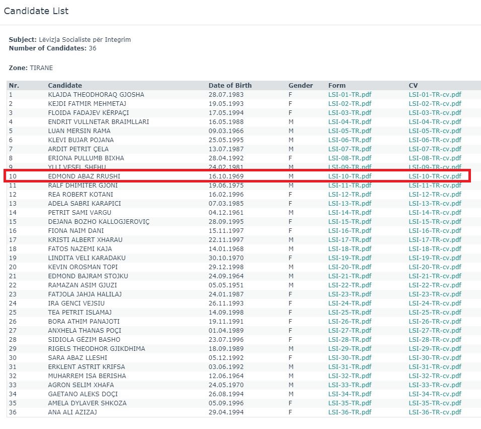 Duke e nisur në rend kronologjik, i fundit që ka pranuar këtë kërkesë ka qënë kandidati i LSI-së për Qarkun e Tiranës, Edmond Abaz Rrushi. Ai ka dorëzuar sot formularin e dekriminalizimit dhe është në pritje të vendimin të KQZ për t’i dhënë mandatin e deputetit në Qarkun e Tiranës.