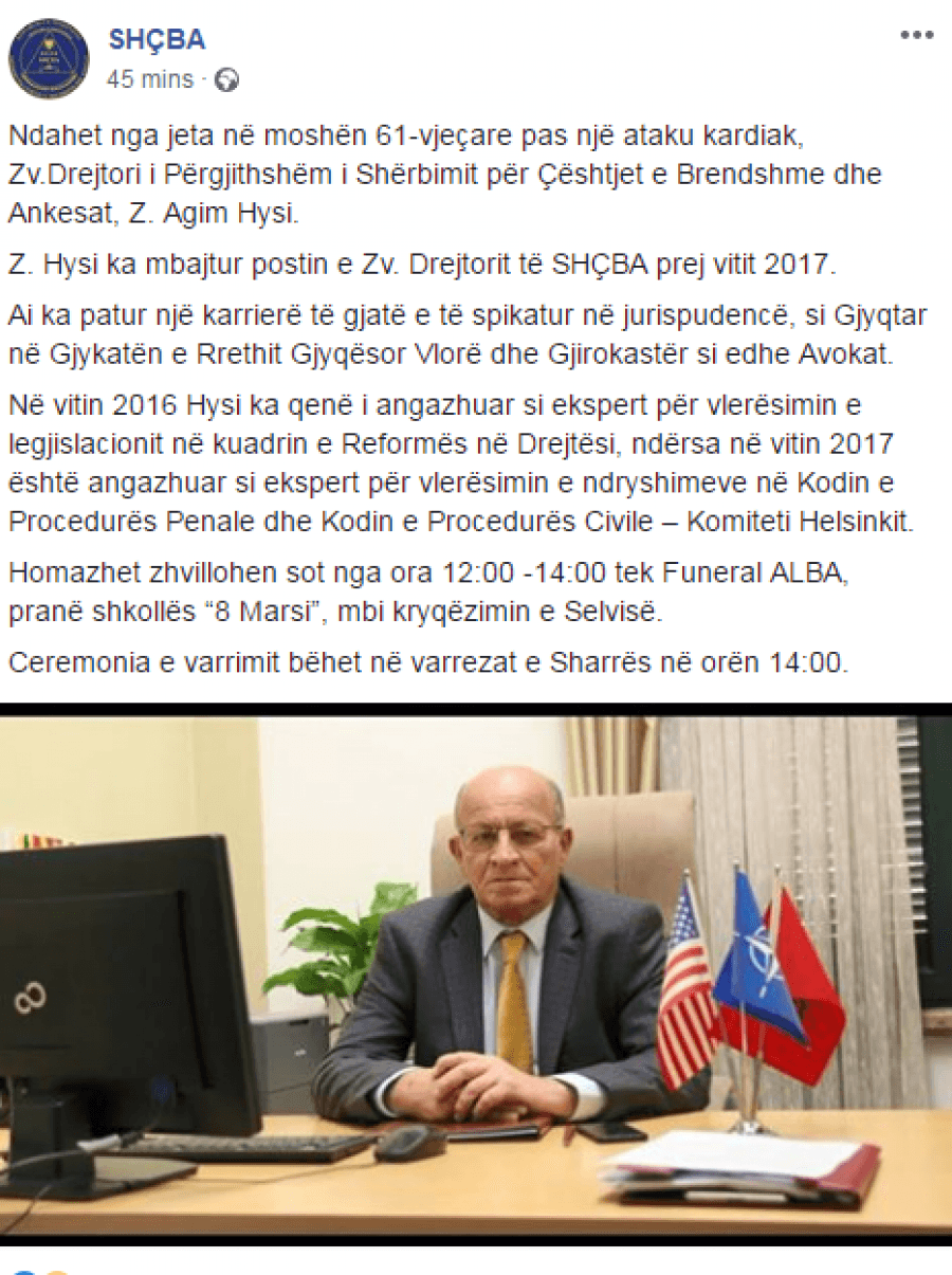 Është ndarë nga jeta ZV. Drejtori i Përgjithshëm i Shërbimit për Çështjet e Brendshme dhe Ankesat, z. Agim Hysi.
