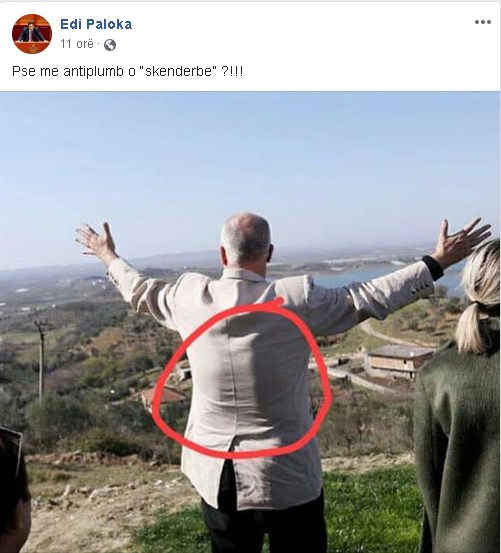“Pse me antiplumb o “Skenderbe” ?!!!”, shkruan Paloka, duke theksuar me rreth të kuq zonën ku mendon se ai mban veshur antiplumbin.