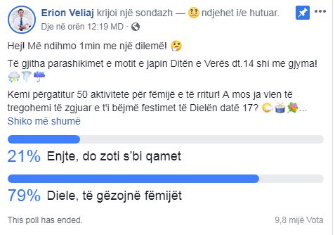Pas sondazhit në rrjetet sociale, Veliaj e ka zyrtarizuar vendimin përmes një fotoje që ka postuar në Facebook.