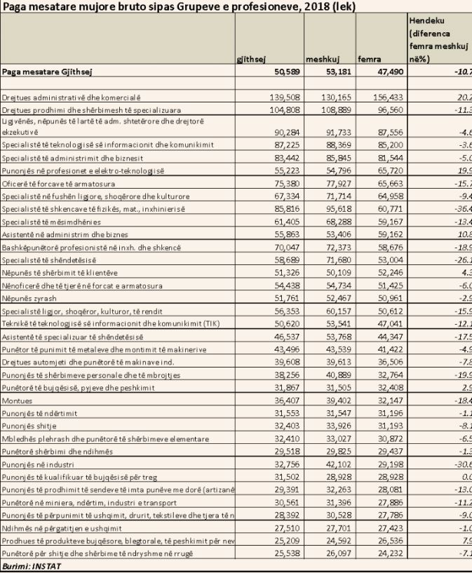 Femrat në Shqipëri edhe pse kanë të njëjtin pozicion me meshkujt, përgjithësisht paguhen më pak se ta. Sipas të dhënave të INSTAT, në 2018-n, paga mesatare e femrave ishte 47.5 mijë lekë, ndërsa e meshkujve 53.2 mijë lekë. Në total, meshkujt u paguan 10.7% më shumë sesa femrat, duke rritur lehtë hendekun gjinor në raport me vitin e mëparshëm, kur kjo diferencë ishte 10.5%. Fakti që pagat e meshkujve janë rritur më shumë në krahasim me ato të femrave, përkatësisht me 3.5% dhe 3.2% ka ndikuar në këtë tendencë.