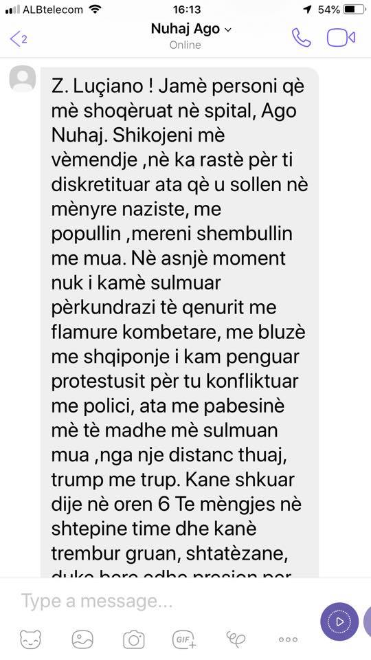 “Njeriut të veshur me flamur kombëtar ditën e 16 Marsit, pasi e helmuan me LHL, i dhunojnë familjen. Jenicerët e Ramës, ushtrojnë kontroll në 6.00 të mëngjesit në shtëpinë e Ago Nuhajt dje, pa asnjë shkak dhe terrorizojnë familjen e gruan shtatzënë të tij!!!