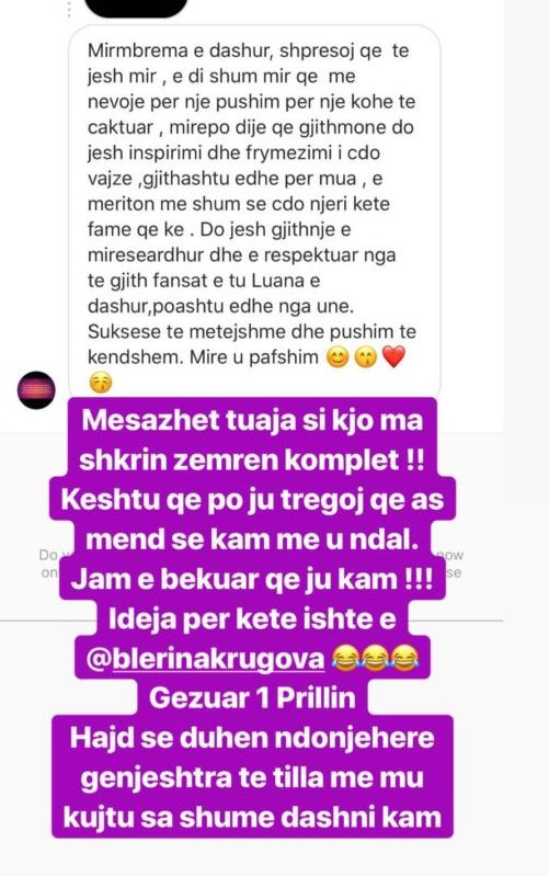 “Mesazhet tuaja si kjo ma shkrin zemrën komplet!! Kështu që po ju tregoj që as nuk e kam mend të ndalem. Jam e bekuar që ju kam!!! Ideja për këtë ishte e Blerina Rugovës. Gëzuar 1 Prillin. Hajde se duhen ndonjëherë gënjeshtra të tilla të më kujtoni sa shumë dashuri kam. Nuk heq dorë kurrë sa t’iu kem ju…për ju! Me ju gjithmonë”, shtoi ajo në një tjetër Insta Sory.
