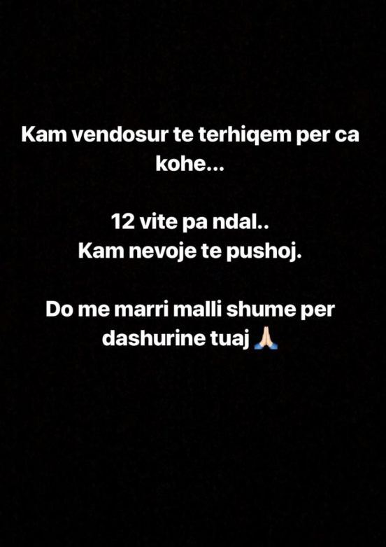 Kam vendosur të tërhiqem për ca kohë… 12 vite pa ndalim… Kam nevojë të pushoj. Do më marri malli shumë për dashurinë tuaj”, njoftoi këngëtarja përmes një postimi në Insta Story dhe menjëherë vërshuan komentet.