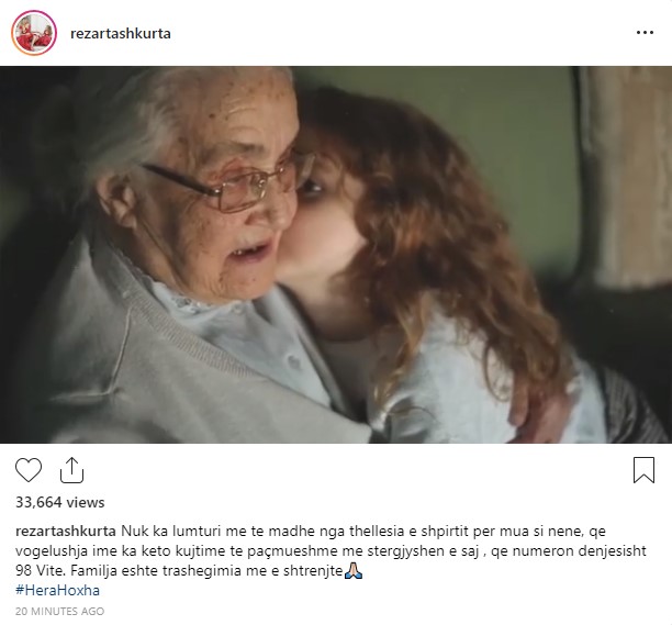 ‘Nuk ka lumturi me te madhe nga thellesia e shpirtit per mua si nene, qe vogelushja ime ka keto kujtime te paçmueshme me stergjyshen e saj , qe numeron denjesisht 98 Vite. Familja eshte trashegimia me e shtrenjte #HeraHoxha’-shkruan ajo krah videos së postuar.